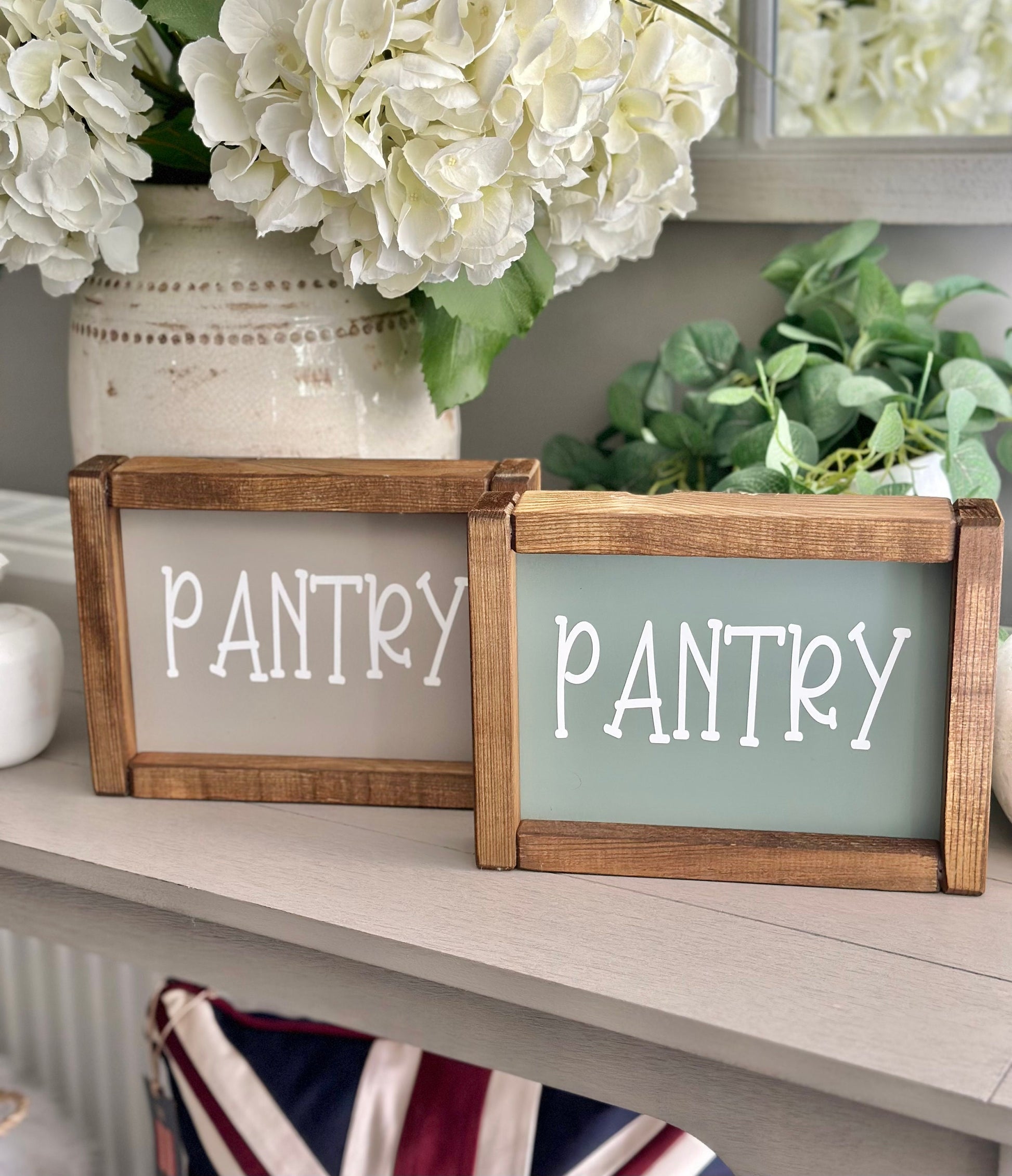 Dress your Kitchen Pantry with one of handmade signs. Solid wooden frame with either a Sand or Duck Egg background frame and White wording.