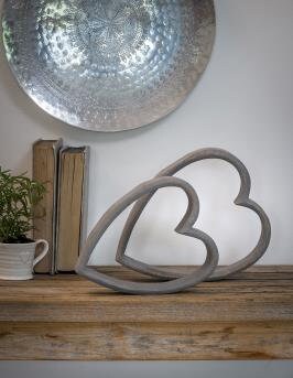 Gorgeous pair of heart decorations carved from natural solid mango wood, hanging from a hessian rope.