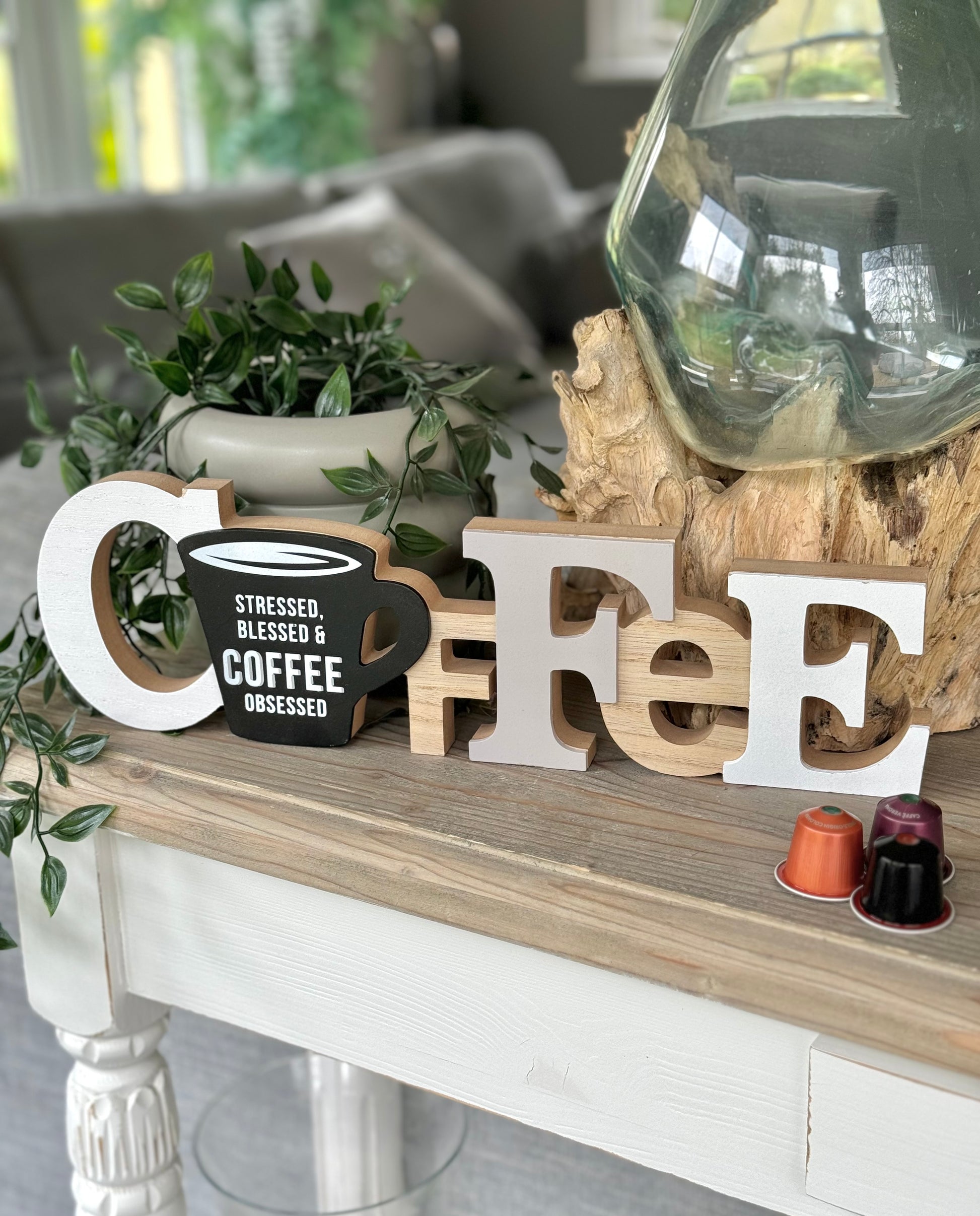 Charming coffee sign. This simple yet elegantly chic styled coffee sign is designed add a finishing touch to your kitchen, office, coffee bar etc. This coffee sign is a wonderful way to express your love for coffee.