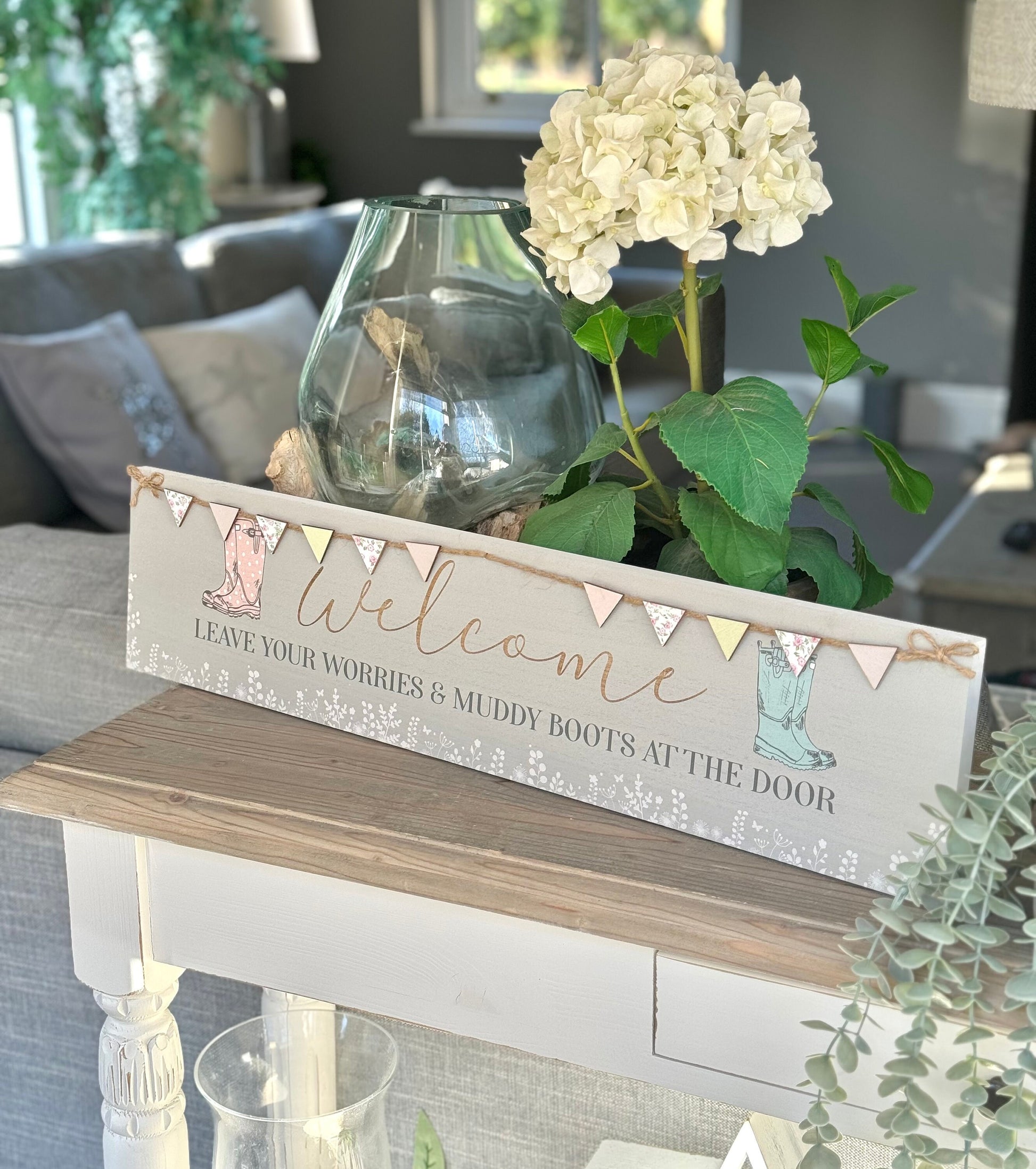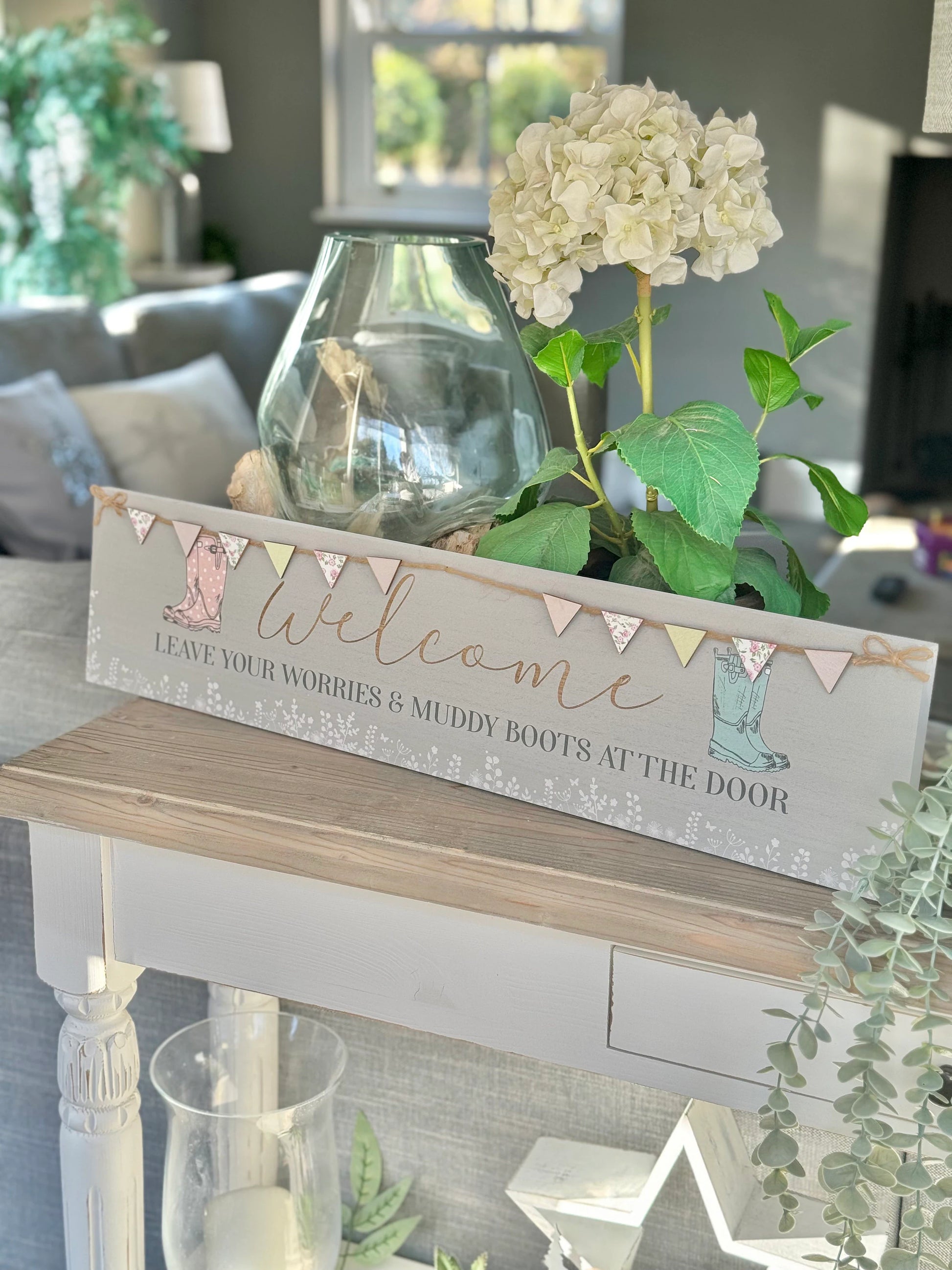 A taupe coloured sign with the quote " Welcome, leave your worries and welly boots at the door".