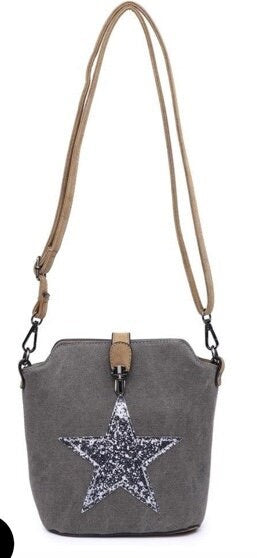 A beautiful X Body Canvas bag with a sparkling silver star on the front.